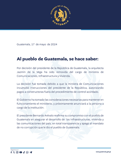 En un comunicado oficial, el Gobierno de Guatemala explicó que la destitución se debió a que la ministra incumplió instrucciones presidenciales al autorizar pagos a constructoras fuera del procedimiento de control establecido. «La decisión fue tomada debido a que la ministra de Comunicaciones incumplió instrucciones del presidente de la República, autorizando pagos a constructoras fuera del procedimiento de control acordado», indica el documento.